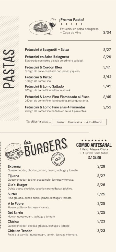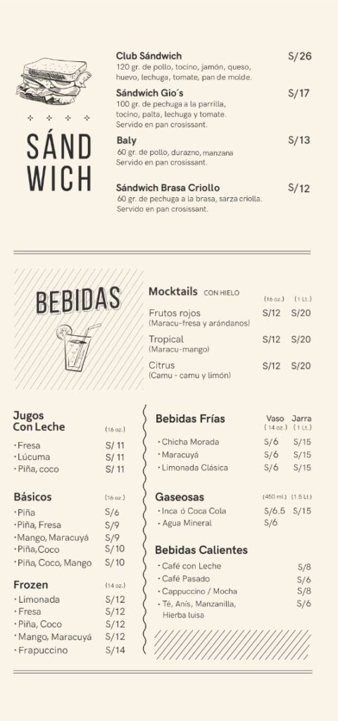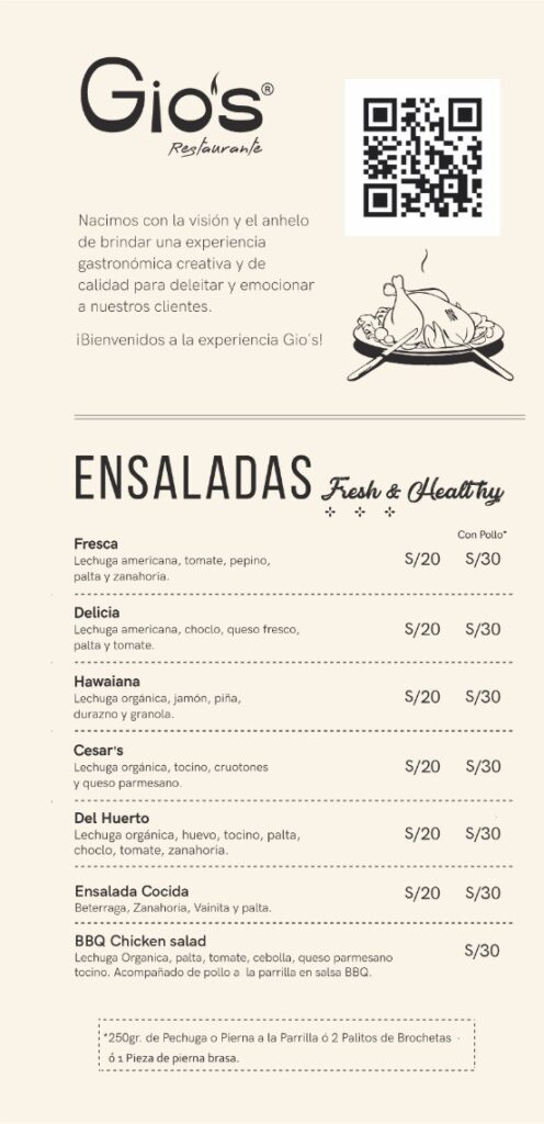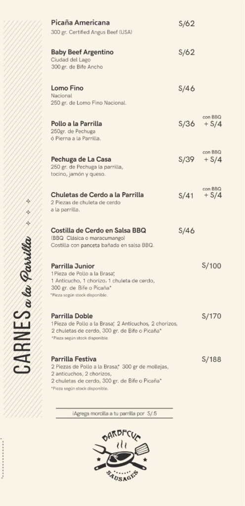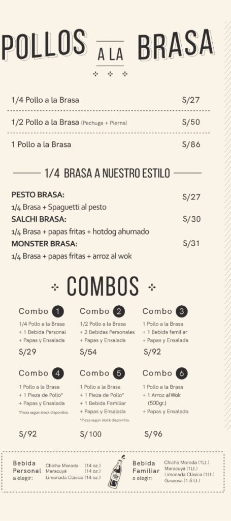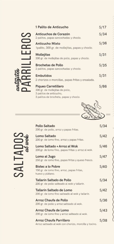 Horario de ingreso Domingo a jueves de 12:00 p.m. a 11:00 p.m. Viernes y sábados de 12:00 p.m. a 11:30 p.m. Cierre de cocina Puedes hacer tu pedido hasta: Domingo a jueves 11:30 p.m. Viernes y sábado 12:00 a.m. TÚ ELIGES EL ALMUERZONOSOTROS PONEMOS LA BEBIDA De lunes a viernes de 12:00 pm a 5 pm (No feriados) Aplica para salón, llevar y delivery. Pide una de estas opciones : 1/4 de Pollo a la Brasa Anticuchos Brochetas de pollo a la parrilla Mollejitas Pollo saltado Lomo Saltado Arroz chaufa de pollo Arroz chaufa de lomo fino Arroz chaufa Parrillero y te invitamos cualquiera de estas bebidas personales: Chicha morada Limonada Maracuyá Jugo de piña S/ 31.00 300 gr de mollejitas de pollo, papas sancochadas y choclo S/35.00 2 palitos, papas sancochadas y choclo. S/ 34.00 2 palitos, papas sancochadas y choclo. S/ 27.00 1/4 de pollo a la brasa con papas amarillas fritas y ensalada S/34.00 200 gr de pollo, arroz y papas amarillas fritas S/ 42.00 200 gr de lomo fino, arroz y papas amarillas fritas S/ 36.00 200 gr de pollo y arroz salteado al wok S/43.00 200 gr de lomo fino y arroz salteado al wok S/ 38.00 Arroz salteado al wok con chorizo, morcilla y tocino